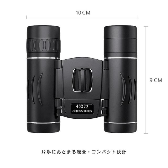 | サイズについての説明 | 【商品仕様】 ・形式:プリズム双眼鏡 ・内容品:双眼鏡本体、双眼鏡ケース ・サイズ:幅10×縦9cm ・重さ約170g ・倍率:40倍 ・プリズム材質:BAK4 ・接眼レンズ:15mm ・対物レンズ:22mm ・射出瞳:約20mm ・フォカース機能:センターフォーカス ・レンズコーティング:完全多層コーティング(FMC) ・視野:約2000m/20000m |