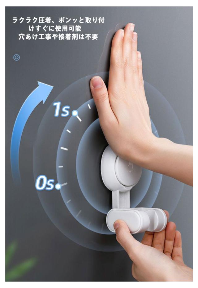 | 穴あけ不要! 角度調節可能!押すだけの簡単取り付けるシャワーフック 【カンタン取り付けですぐに使える】 ・ラクラク圧着、ポンッと取り付けすぐに使用可能 ・穴あけ工事や接着剤は不要 【設置や角度は自由自在】 ・取り付け位置は自由に調節 ・360度回転、上下は70度間で調整可能 【水に強く、長持ち】 ・防水防湿に優れたシャワーフック ・耐久性が高く長期の使用が可能 【取り付けできる表面】 ・凹凸差0.5mm以内の表面(目の粗いタイルやガラスも可) ・気密性の高い硬質素材の表面 ・タイル、人工大理石、ガラス、アクリルパネルなど 【取り付けできない表面】 ・しっくい、砂壁、ラテックス素材の壁、クロス ・劣化したタイル、天然大理石、未塗装の木材パネルなど 【取り付け/取り外し方法】 1.取り付け面をキレイに拭きます 2.力を入れて壁に押し付ければ設置完了です 3.取り外す時は、硬いカードなどで接着面に差し込むと剥がれます 4.吸着裏面を水洗いすれば繰り返し使用できます | |