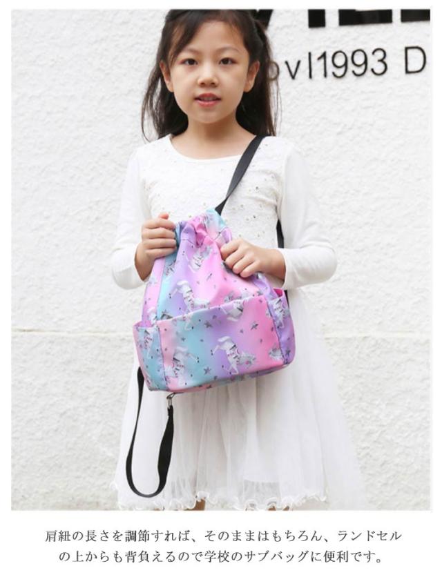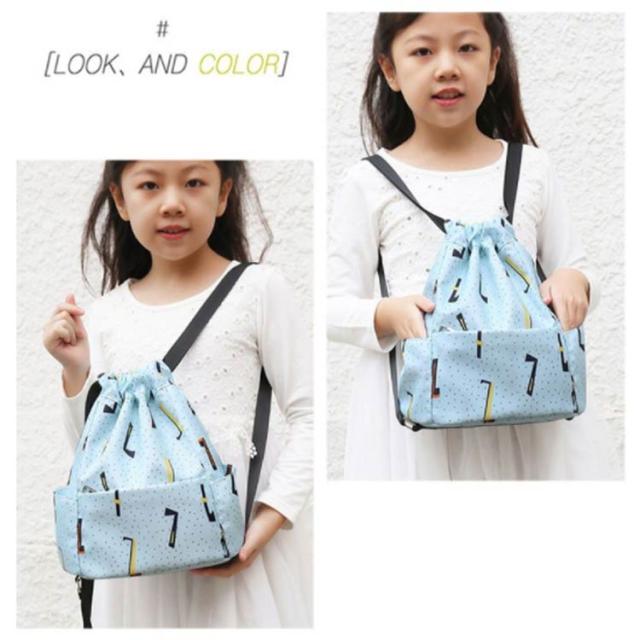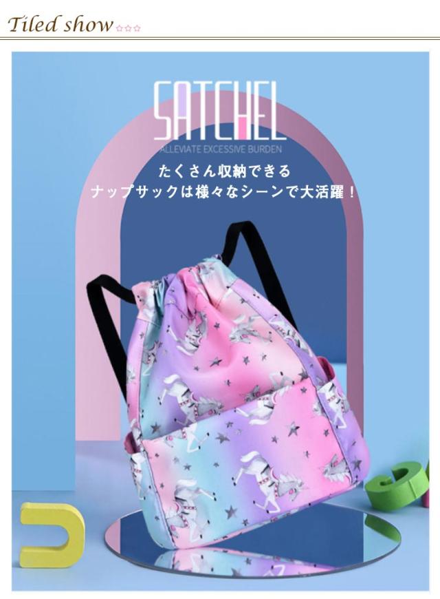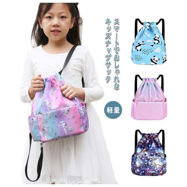 | スマートでおしゃれなキッズナップサック たくさん収納できるナップサックは様々なシーンで大活躍! 撥水生地を採用するのでプール、ビーチや雨天などでも安心に! 豊かなポケット付き、小物を入れるのにちょうどいい! 肩紐の長さを調節すれば、そのままはもちろん、ランドセルの上からも背負えるので学校のサブバッグに便利です。 プールバッグ、ダンスバッグ、通園通学のサブバッグや通塾バッグ、遠足やピクニック、林間学校旅行など幅広いシーンに対応。 | |