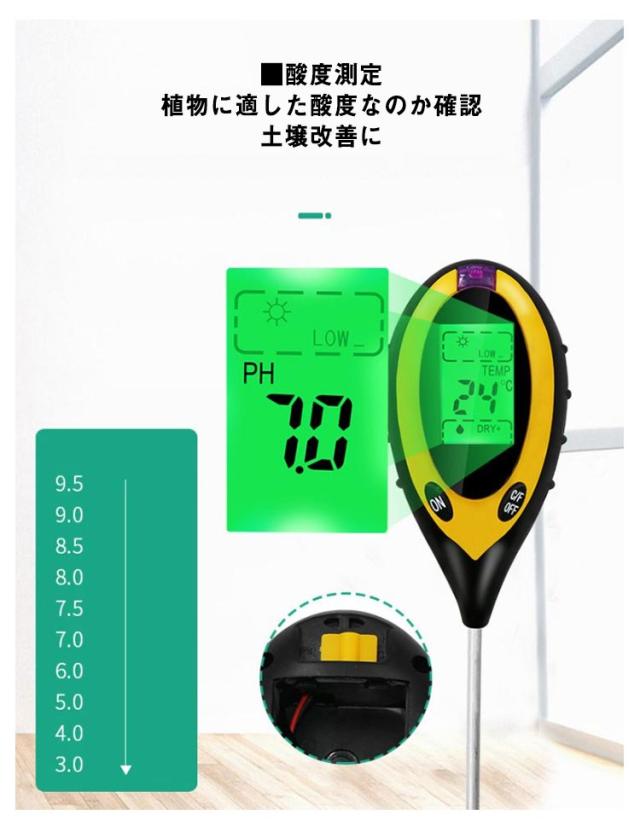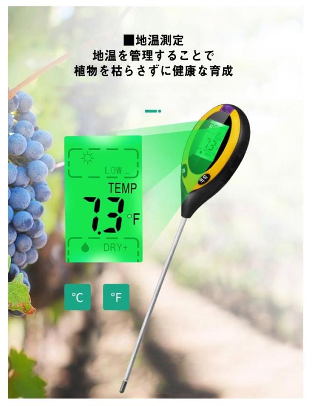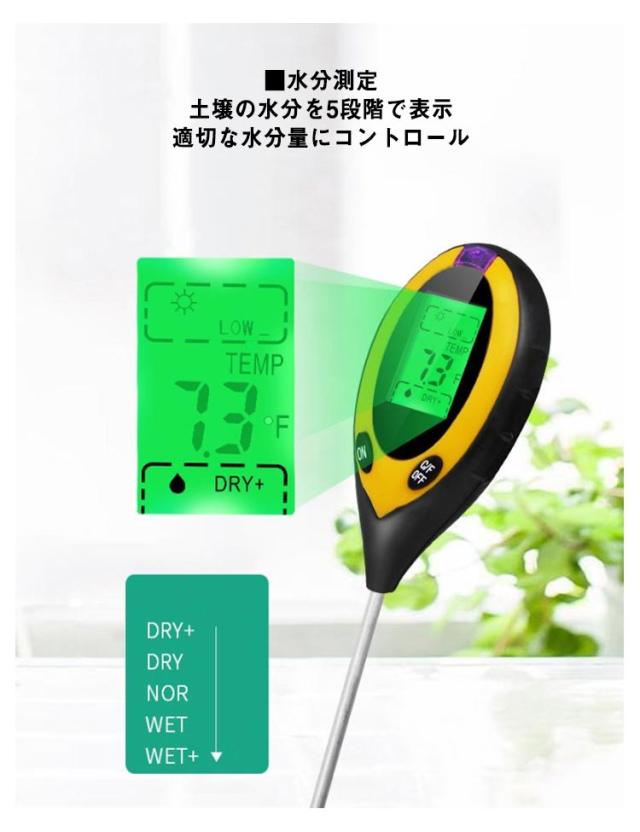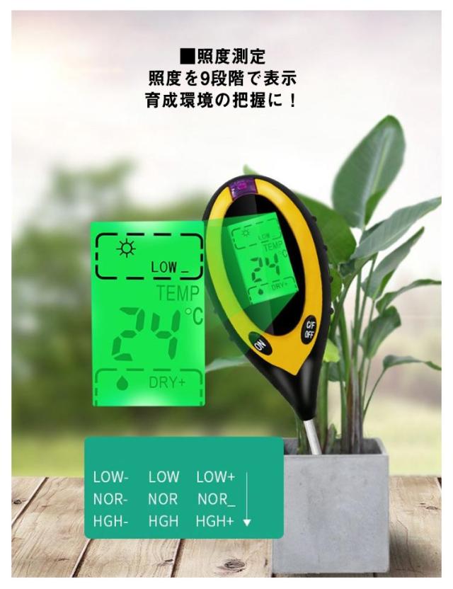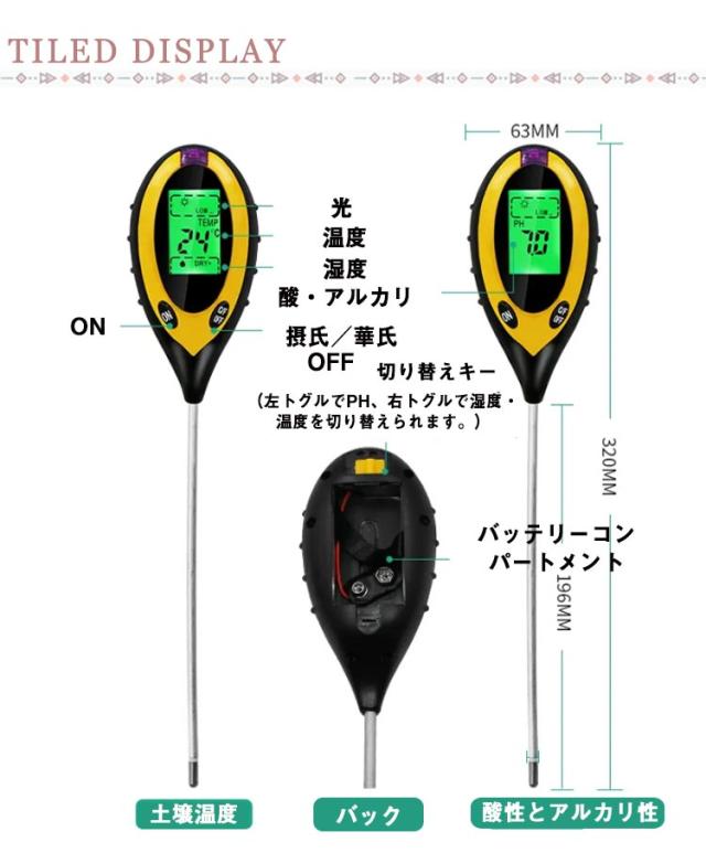 | サイズについての説明 | ●サイズ(約):340mm*63mm*36mm ●給電:9V 角型電池使用(別売) ●温度測定範囲(約):-9〜+ 50℃(16〜122?)(精度:1℃ / 1?) ●pH測定範囲(約):3.5-9.0 ●照度(9段階):LOW-、LOW、LOW+、NOR-、NOR、NOR+、HGH-、HGH、HGH+ ●土壌水分量(5段階):DRY+、DRY、NOR、WET、WET+ ※PH値と温度は数値で表示され、明るさと水分は文字で表示されます。 |