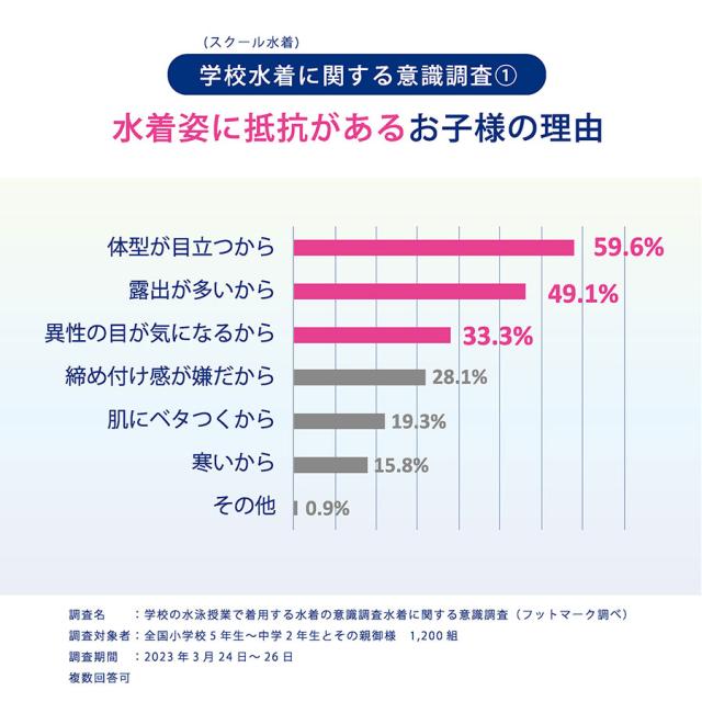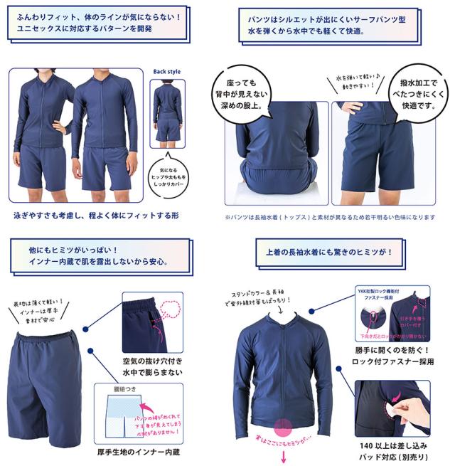 体型の違いが目立たないデザインにしました。上着は一枚で着て泳げます。