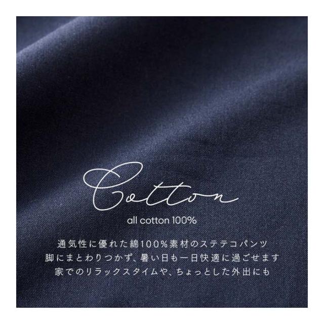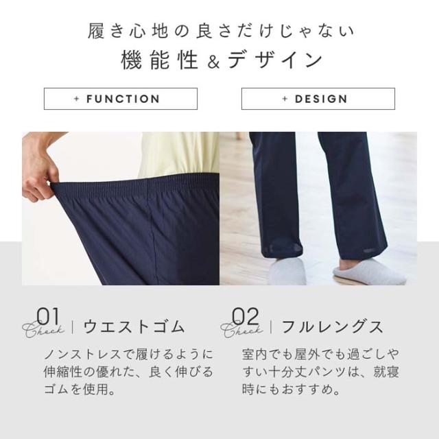| 綿100%でサラッとした履き心地。洗い替えに便利な下だけロングパンツ。お尻まわりがゆったりとしたシルエットで、部屋着やパジャマとしてはもちろん、ちょっとしたお出かけにも使えます。前閉じタイプ。 | |