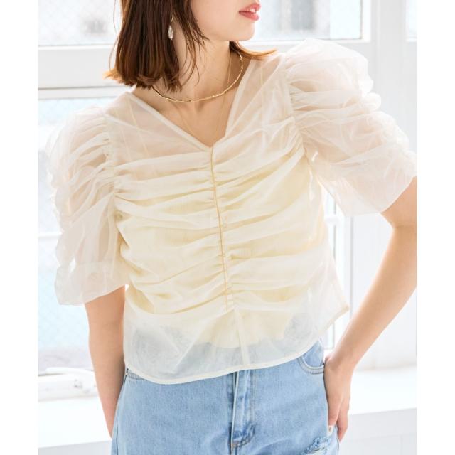 華やかなギャザーデザインが軽やかでエアリーな印象のトップス。