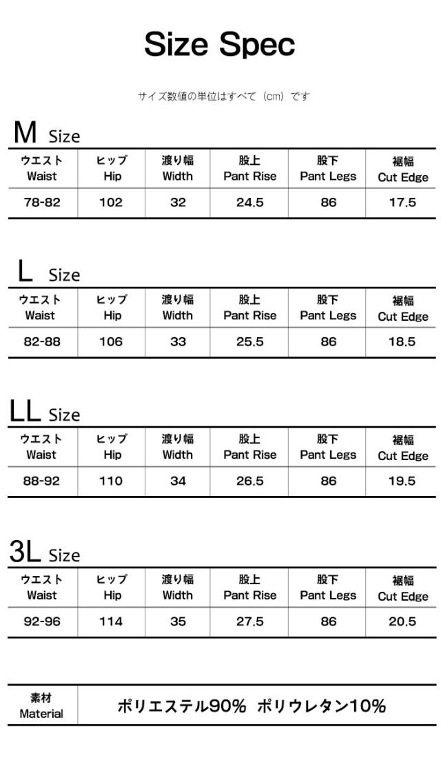 LL:ウエスト88-92ヒップ110渡り幅34股上26.5股下86裾幅19.5