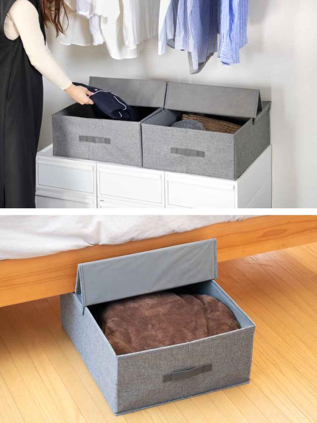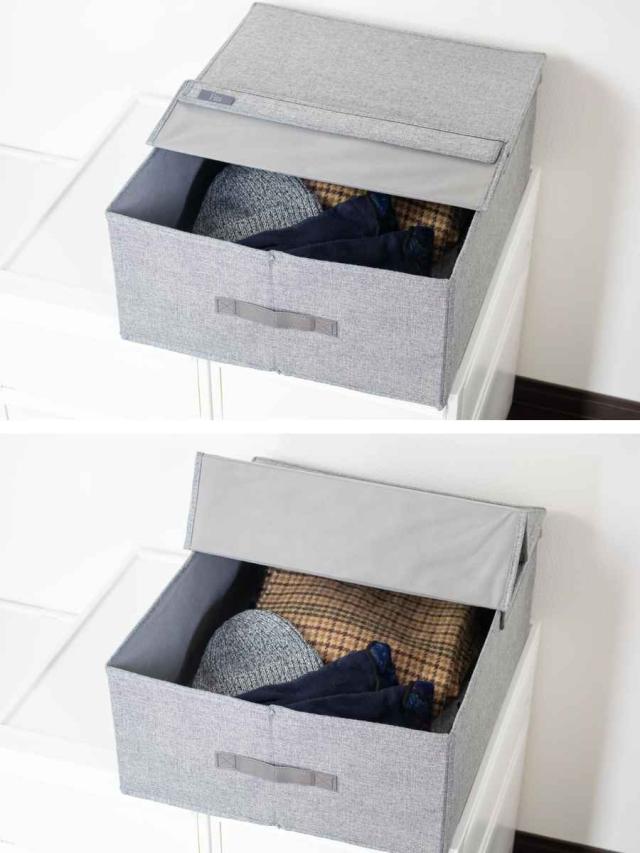 フタが半分だけ開いて取り出したい物をサッと取り出せる布製収納ボックスです。ごちゃごちゃしがちなクローゼット内の衣類や小物類をスッキリと収納できて、見た目もキレイに整理することができます。