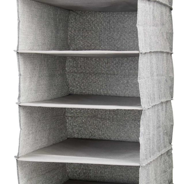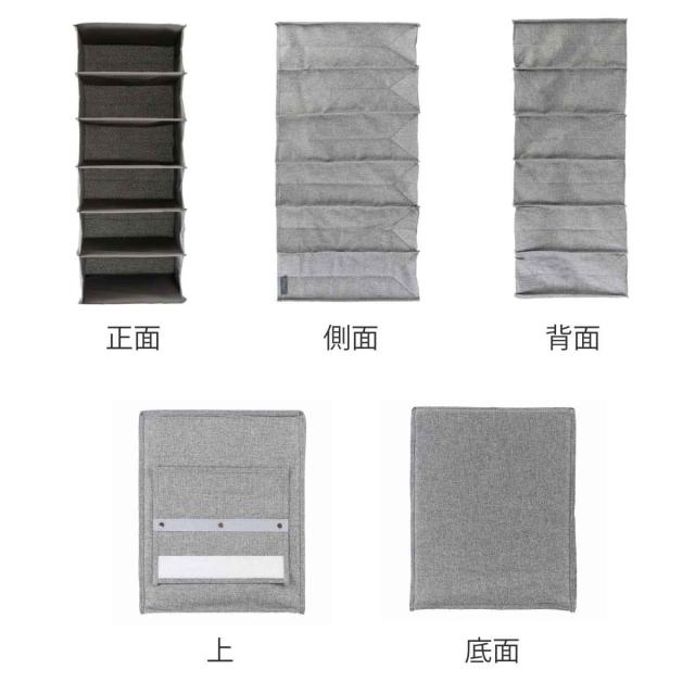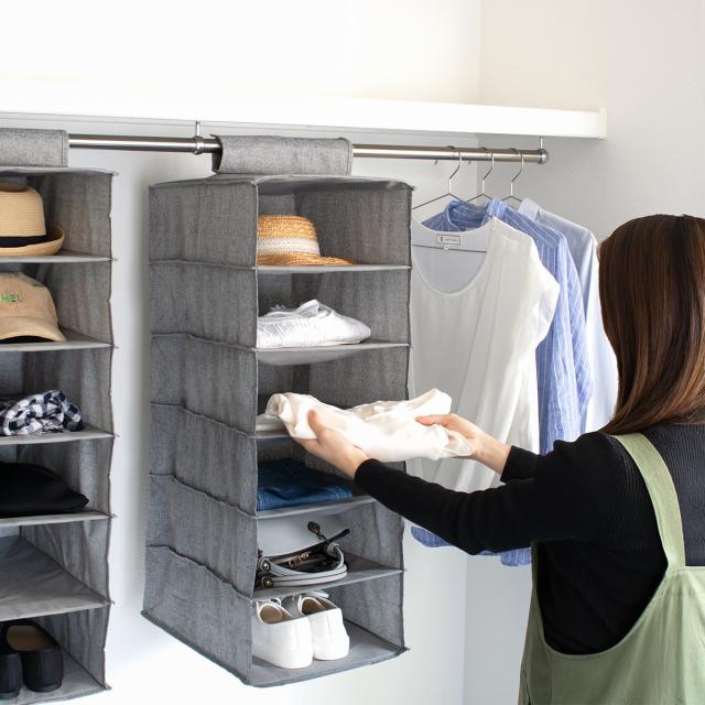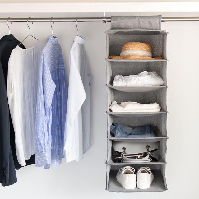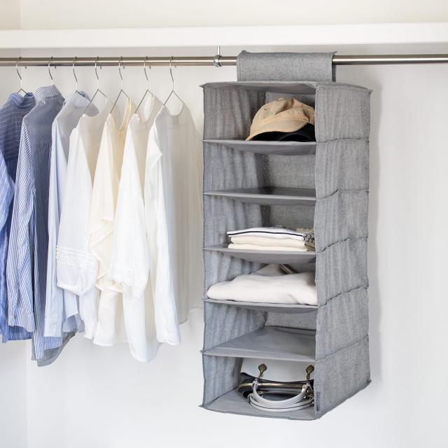 クローゼットやパイプハンガーに簡単に取り付けできる布製ハンギングラックです。ごちゃごちゃしがちなクローゼット内の小物をスッキリと収納できて、見た目もキレイに整理することができます。