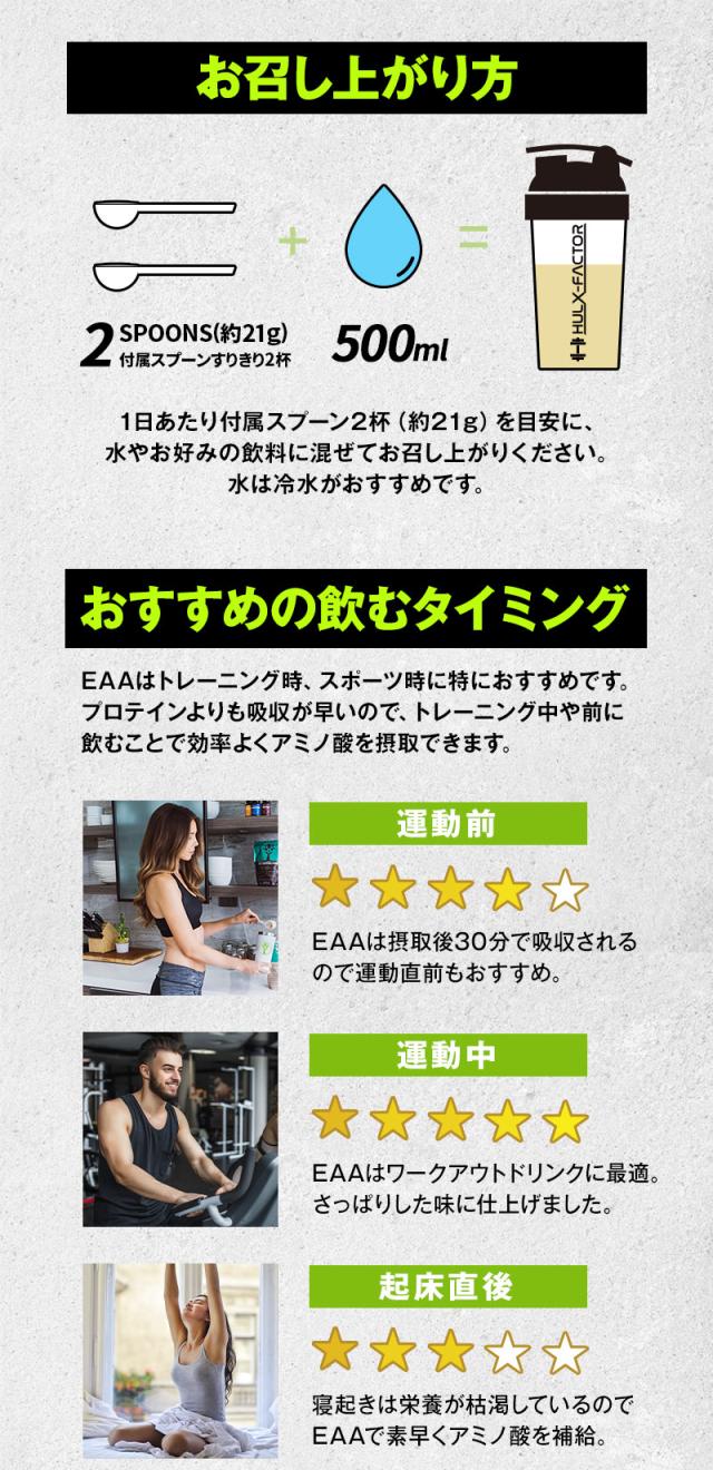 | 1日あたり付属スプーン2杯(約21g)を目安に水やお好みの飲料(約500ml)に混ぜてお召し上がりください。水は冷水を使用するとよりおいしくお召し上がりいただけます。運動前や運動中の摂取がおすすめです。 |