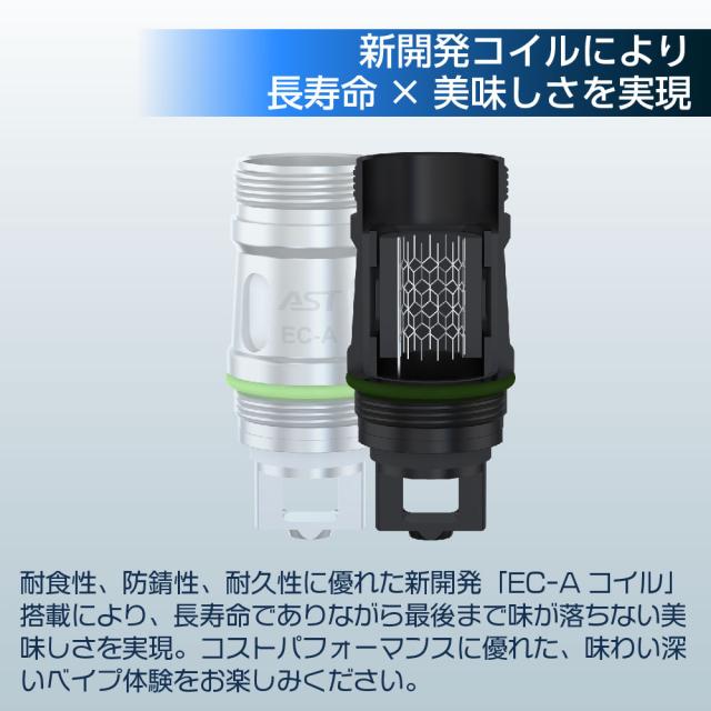 耐食性、防錆性、耐久性に優れた新開発「EC-Aコイル」搭載により、長寿命でありながら最後まで味が落ちない美味しさを実現。コストパフォーマンスに優れた、味わい深いベイプ体験をお楽しみください。