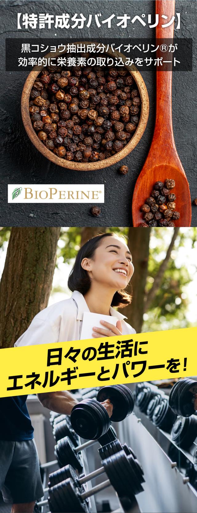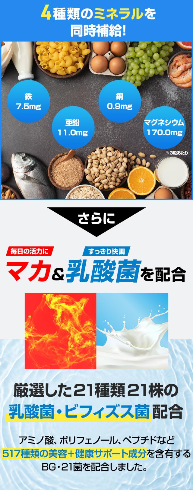 | 還元麦芽糖水飴(国内製造)、酵母(マンガン含有)、デキストリン、酵母(セレン含有)、V.E含有植物油、納豆菌滅菌粉末、酵母(ビオチン含有)、酵母(クロム含有)、黒胡椒抽出物、コエンザイムQ10、マカエキス末、BG・21菌発酵物/セルロース、V.C、グルコン酸亜鉛、ピロリン酸第二鉄、ステアリン酸Ca、微粒二酸化ケイ素、ナイアシン、グルコン酸銅、パントテン酸Ca、加工デンプン、ヘスペリジン、イノシトール、V.A、V.B6、V.B2、V.B1、葉酸、サイクロデキストリン、V.D、V.B12、(一部に乳成分・大豆を含む) |
