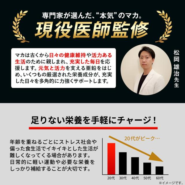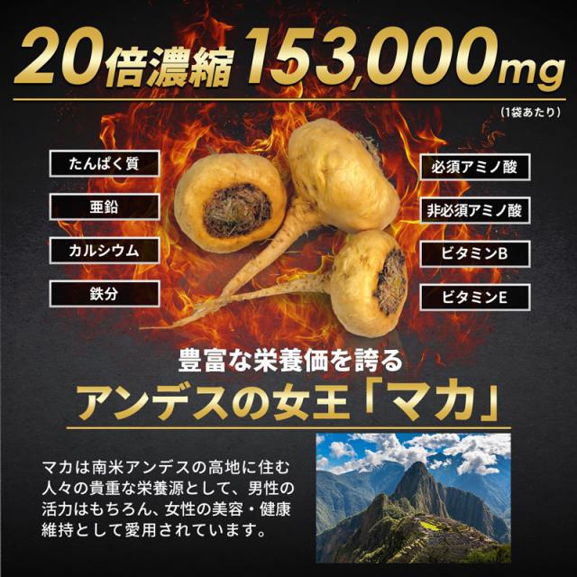 【業界屈指の配合】20倍濃縮マカ153,000mg配合! アンデスに伝わる女王の名を冠す「マカ」に着目し、充実した毎日を送りたい方におすすめの医師監修サプリメントです。