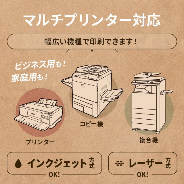インクジェットプリンタ、レーザープリンタ、コピー機でも印刷可能です。手書きもできます。