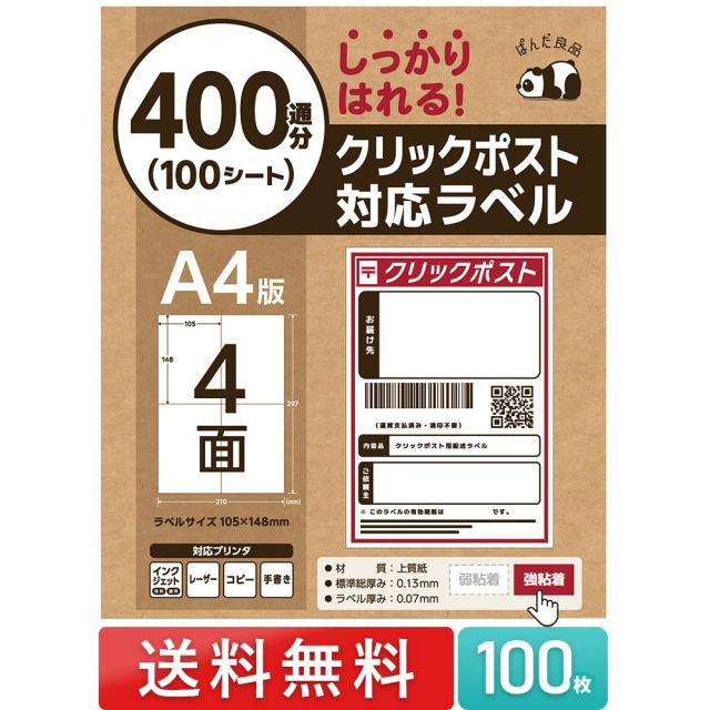 ラベルシール 4面 100枚 A4 A6 サイズ クリックポスト 対応 400通分 しっかり貼れるタイプ 強粘着 出品者向け ラベル 用紙 シート 荷札 宛名 シール 伝票 ラベル 4面 タックシール ぱんだ良品