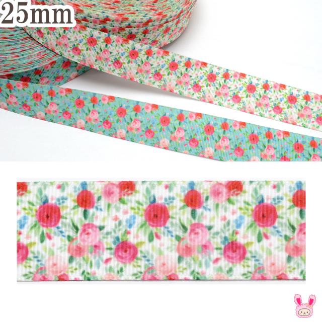 プリントリボン ピンクと赤のローズタイル柄リボン 幅25mm 2m [在庫限り]