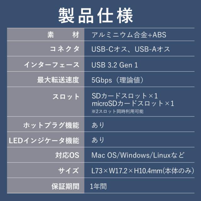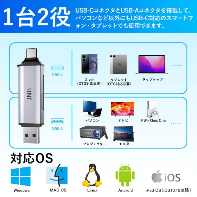 ■幅広対応:コネクタにはUSB-CとUSB-Aの2種類を備える2in1設計,Android スマホ/タブレットPC、iPad Pro、MacBook Pro Air、Windows PCに適用;対応SDカード仕様:SD・SDHC・SDXC;TFカード仕様:Micro SD・Micro SDHC・Micro SDXC;対応OS:Mac OS・Windows・Linux