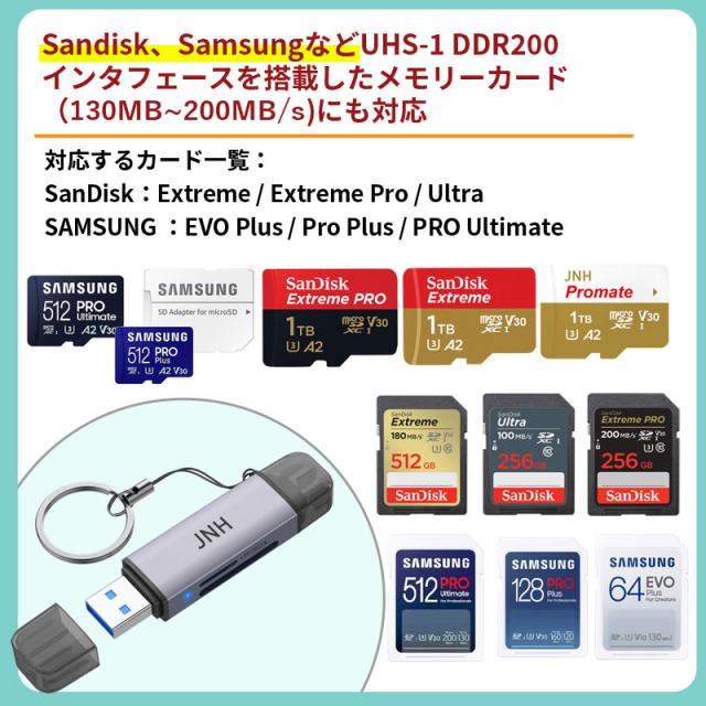 ■高速データ転送:本製品はUHS-I DDR200 モード、SDR104 モード、USB 3.2 Gen 1に対応し、最大5Gbpsの高速データ転送で動画や音楽、写真フォルダなどを即座に同期できます。最大転送速度 DDR200モード:190MB/s、SDR104モード:104MB/s。Sandisk、SamsungなどUHS-1 DDR200インタフェースを搭載したメモリーカード(130MB-200MB/s)にも対応します。(例えば:Sandisk:Extreme/Extreme Pro/Ultra;Samsung :EVO Plus / Pro Plus / PRO Ultimate)