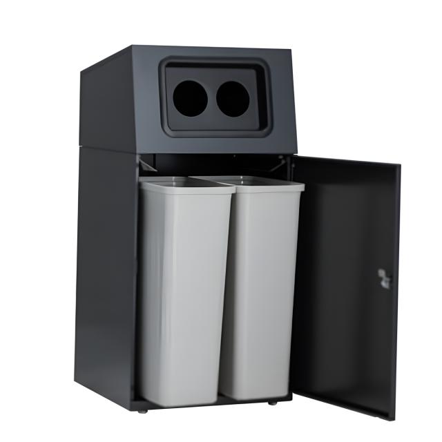 かん・びんを2分別で捨てることができ、ゴミ回収の手間を大幅に削減する屋外分別用ゴミ箱です。上質でシンプルなデザインなので、景観を崩さず様々な施設にマッチします。