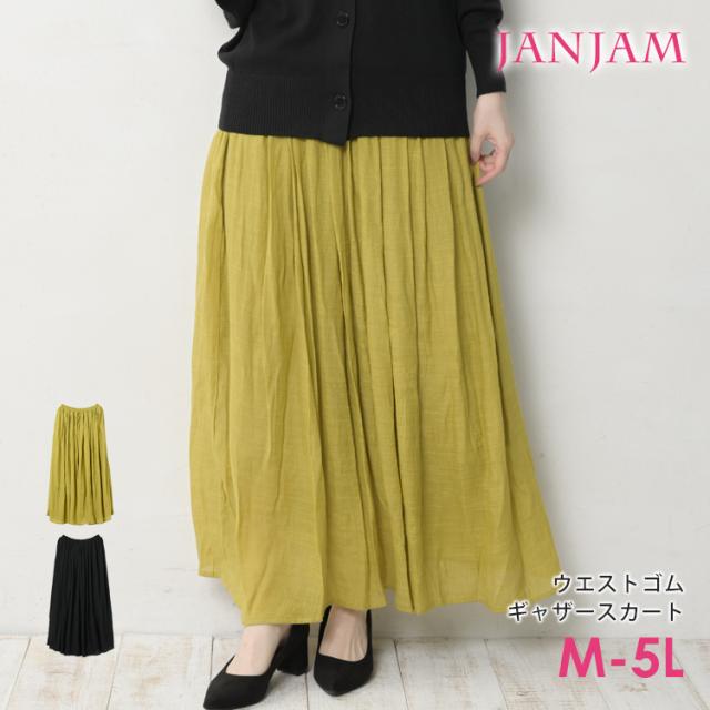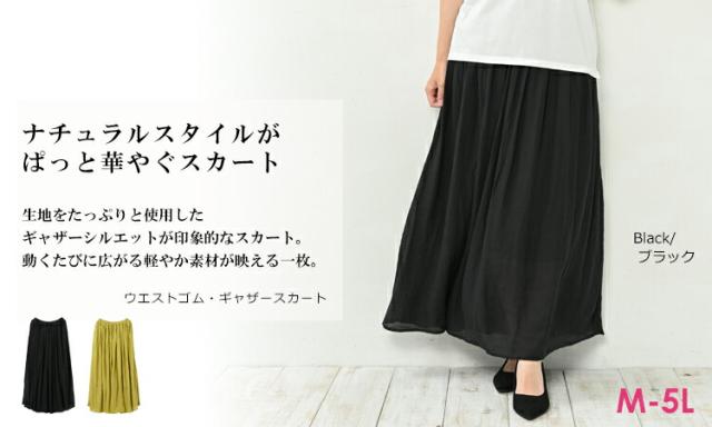 大きいサイズ レディース ギャザースカート ロング丈 ウエストゴム 無地 ボトムス M/LL/3L/4L/5L ゆったりサイズ ぽっちゃり女子 プラスサイズ