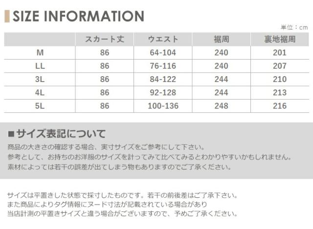 5L:スカート丈86 ウエスト100-136 裾周248 裏地裾周216
