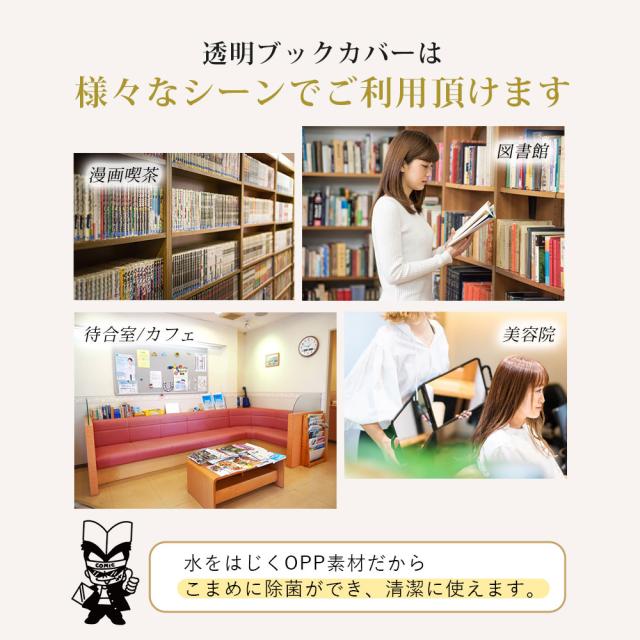 漫画喫茶(漫喫) インターネットカフェ(ネカフェ) TSUTAYA(ツタヤ)やGEO(ゲオ)などのレンタルコミック(貸本屋) 宅配レンタルコミック 学校の図書館 幼稚園 保育園 待合室 中古書店(中古本屋) 文具店 DAISO(ダイソー)やSeria(セリア)等の100円ショップ(100均)、animate(アニメイト)などで販売、利用されている書籍、書物用のお馴染み商品、それが 透明ブックカバー です。