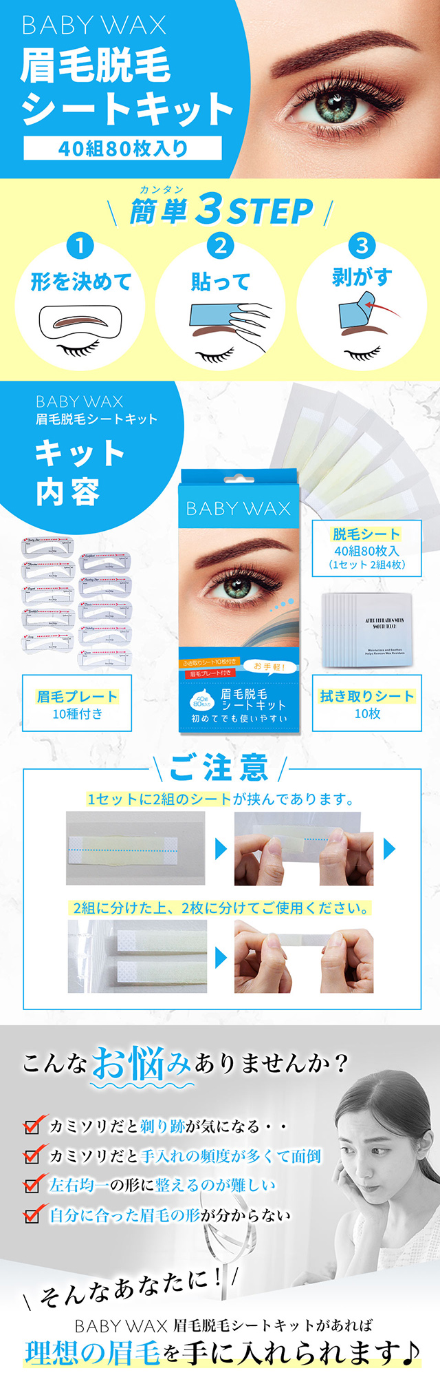 | キット内容 | ・脱毛シート20セット(1セット=2組4枚、合計40組80枚入り) ・ふき取りシート10枚入り ・10種眉プレート(左右1セット) |