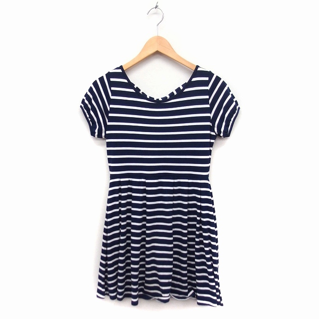 【中古】ミスティウーマン mysty woman ボーダー フレア ワンピース 半袖 ミニ 背あき M ネイビー 紺 /FT19 レディース