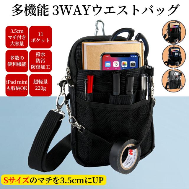 多機能 ウエストポーチ ナースポーチ ウエストバッグ Sサイズ マチ1cmサイズUP版 ダブルジッパー 仕事用 11ポケット マチ付き 3wayショルダー ポシェット 文具 文房具 小物入れ 大容量 作業用 事務 看護 介護 工具入れ ベルト付き 撥水 防傷加工
