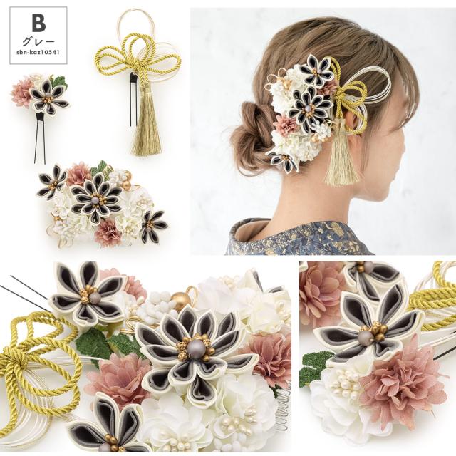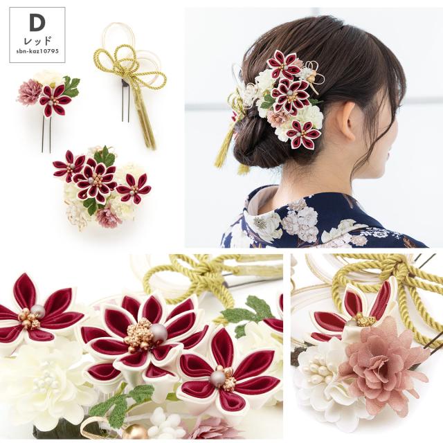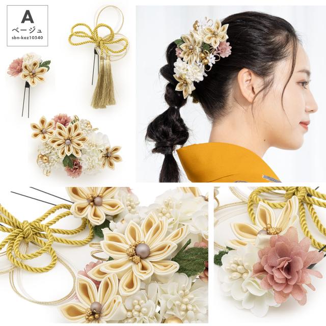髪飾り 3点セット 卒業式 成人式 振袖 袴 着物 ベージュ グレー ホワイト レッド 白 赤 くすみカラー 水引 組紐 つまみ細工 花 和洋兼用 盛装 ヘアアレンジ 振袖小物 和装小物 送料無料