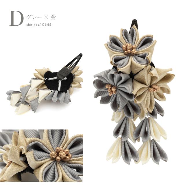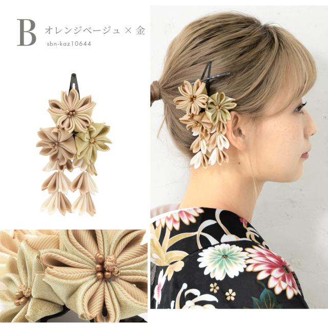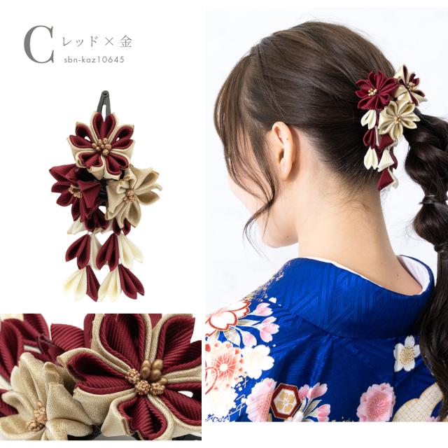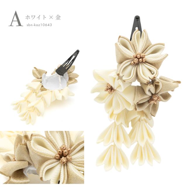 成人式 つまみ細工 髪飾り 振袖 卒業式 袴 桜 花 フラワー ぶら飾り 藤下がり スリーピン ぱっちん留め 白 ベージュ 赤 グレー 黒 金 和装 送料無料