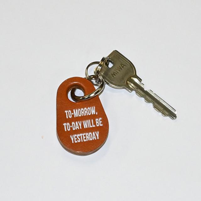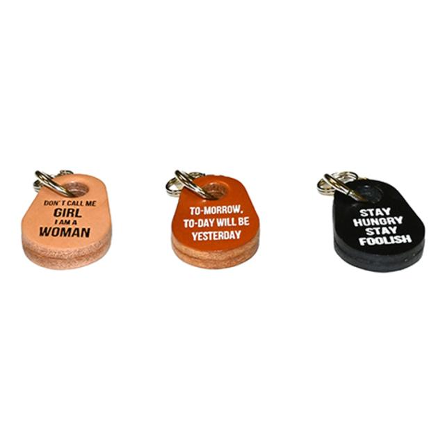 厚口の牛革(栃木レザーベルト用)を2枚合わせ、カウタグ型のキーチャームです。 片面には3種の箔押しを施し、もう一面はブランド素押しとステッチを入れました。 使い込むほどに色が変化していきます。