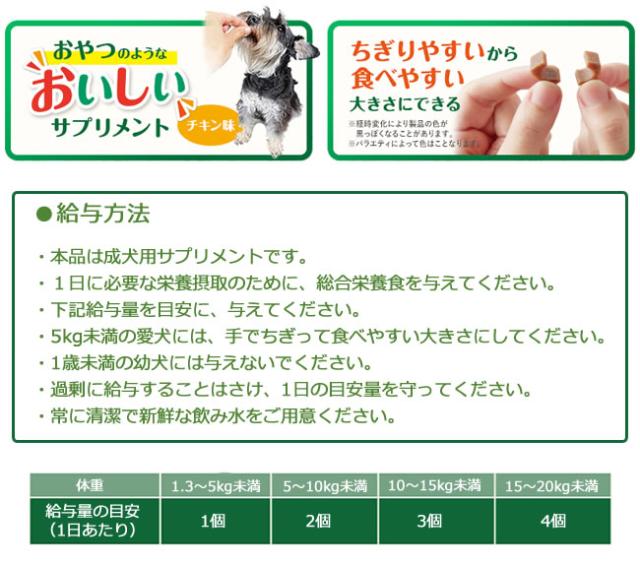 | 適応体重 | (体重:1日の給与目安量) 1.3〜5kg未満:1個 5〜10kg未満:2個 10〜15kg未満:3個 15〜20kg未満:4個 |
