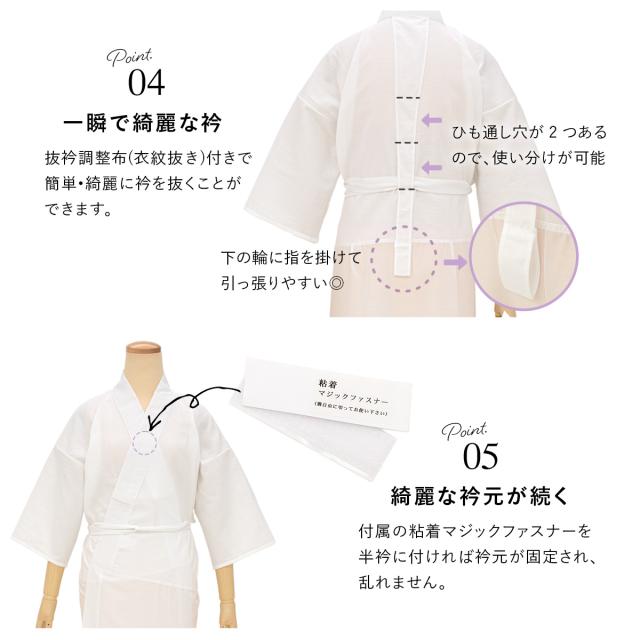衿の着崩れ防止のマジックテープ付きで長襦袢の衿を寄せやすくし、着崩れを防ぎ美しい襟元を作ります。