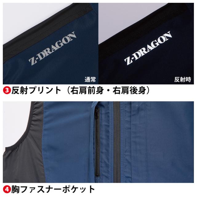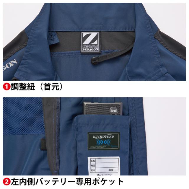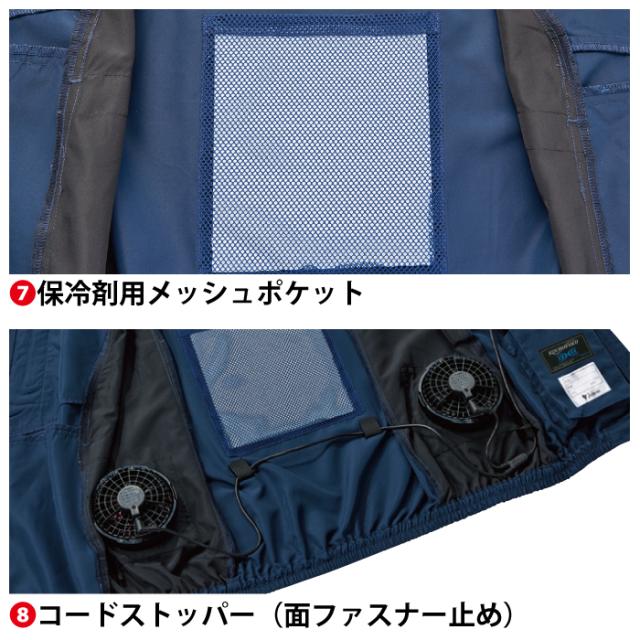 ◇機能:ストレッチ・野帳対応・調整紐(首元)・左内側バッテリー専用ポケット・ランヤードフックかけDカン・ファン脱落防止用メッシュ・保冷剤用メッシュポケット・反射プリント(右肩)・首元タック入り