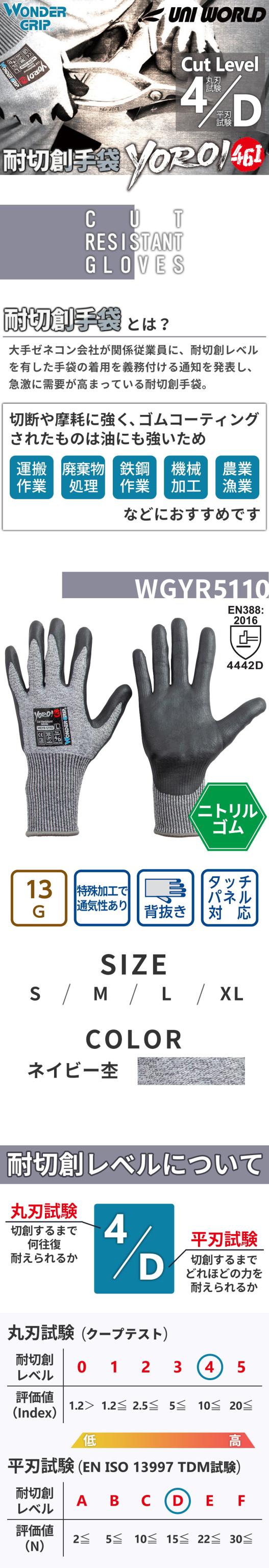 耐切創手袋 ユニワールド ワンダーグリップ 耐切創 YOROI461 ニトリル WGYR5110