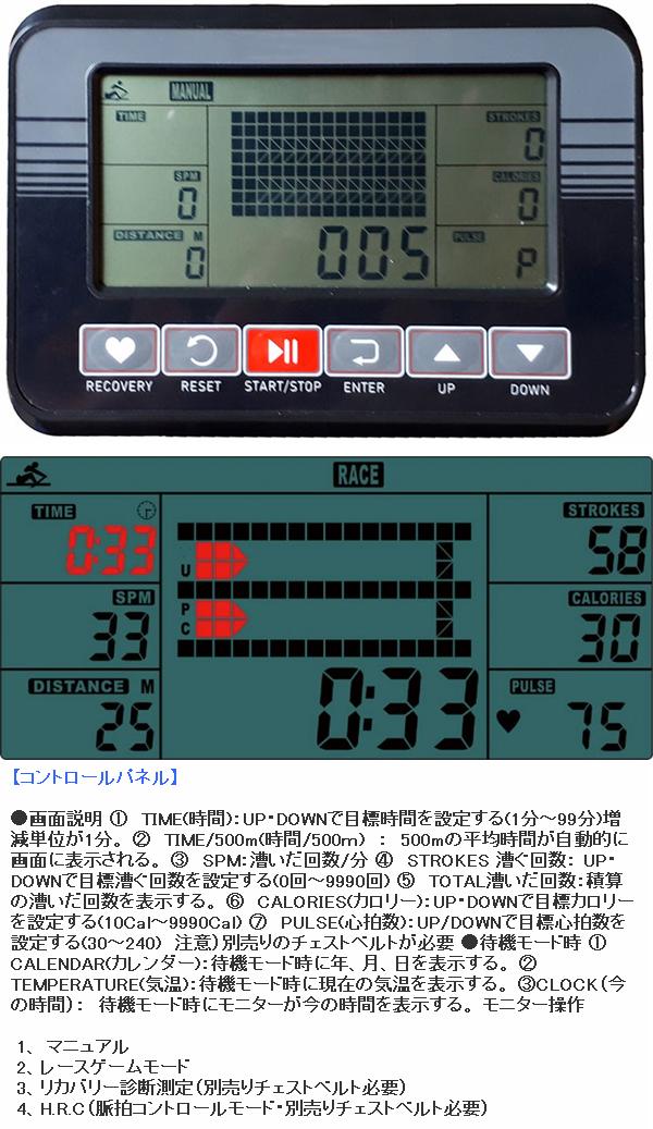 ●計器表示:時間、回数/分、距離、回数、カロリー、500mスプリット