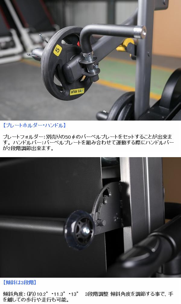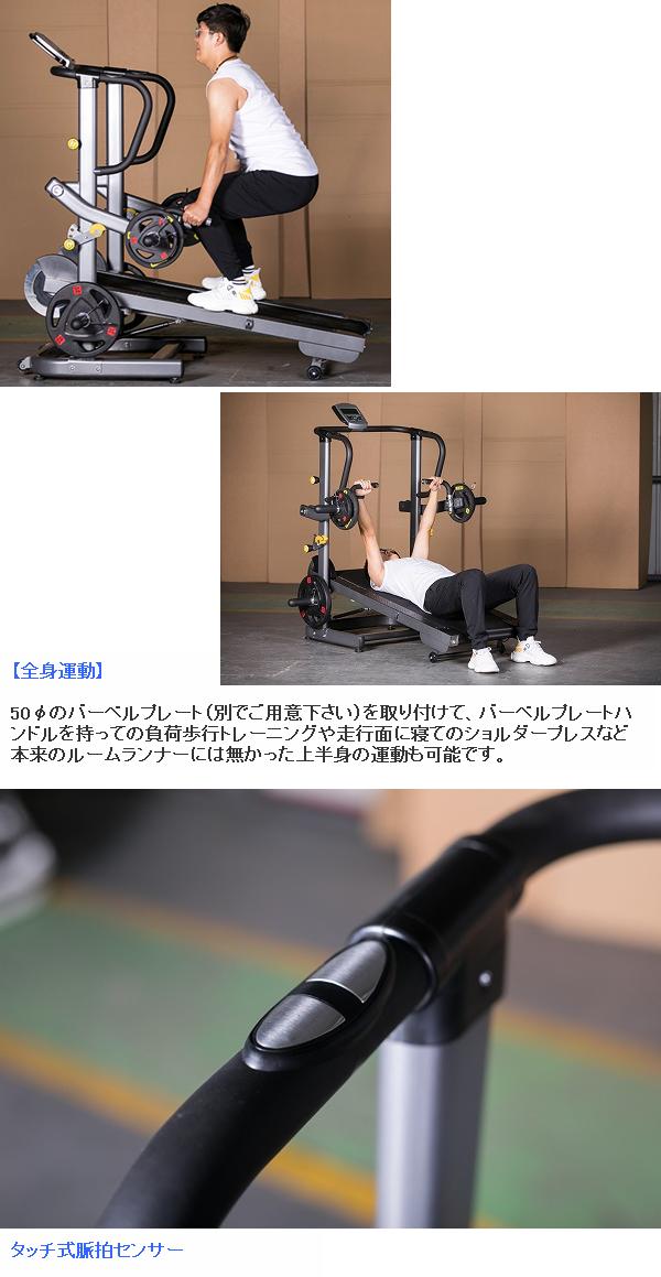 50φのバーベルプレート(別でご用意下さい)を取り付けて、バーベルプレートハンドルを持っての負荷歩行トレーニングや走行面に寝てのショルダープレスなど本来のルームランナーには無かった上半身の運動も可能です。