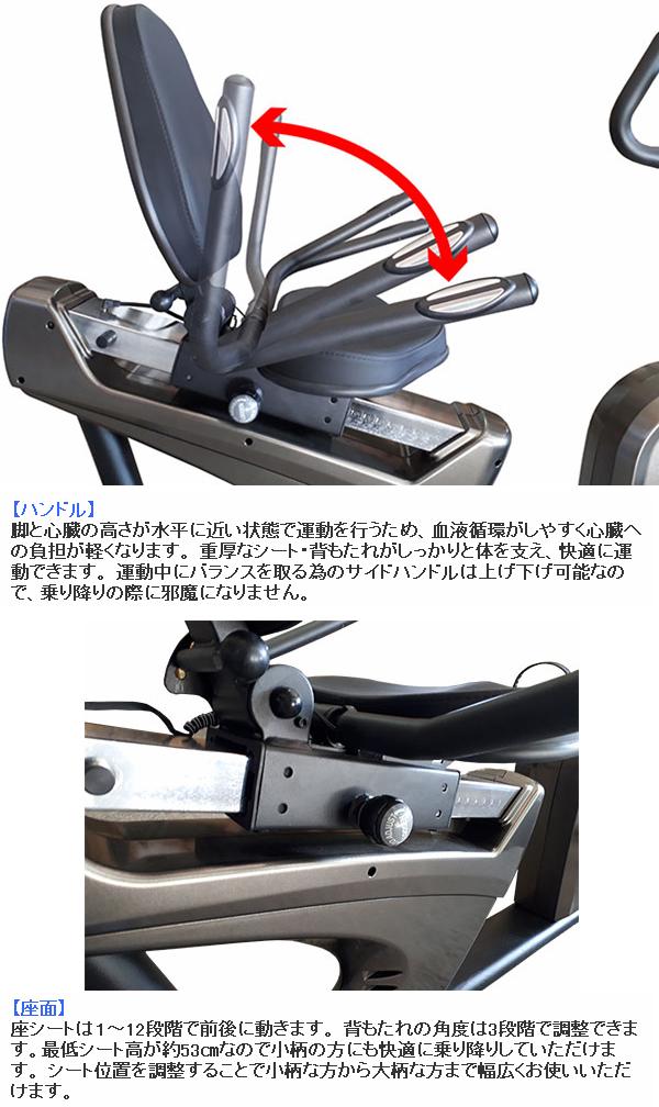 脚と心臓の高さが水平に近い状態で運動を行うため、血液循環がしやすく心臓への負担が軽くなります。 重厚なシート・背もたれがしっかりと体を支え、快適に運動できます。 運動中にバランスを取る為のサイドハンドルは上げ下げ可能なので、乗り降りの際に邪魔になりません。