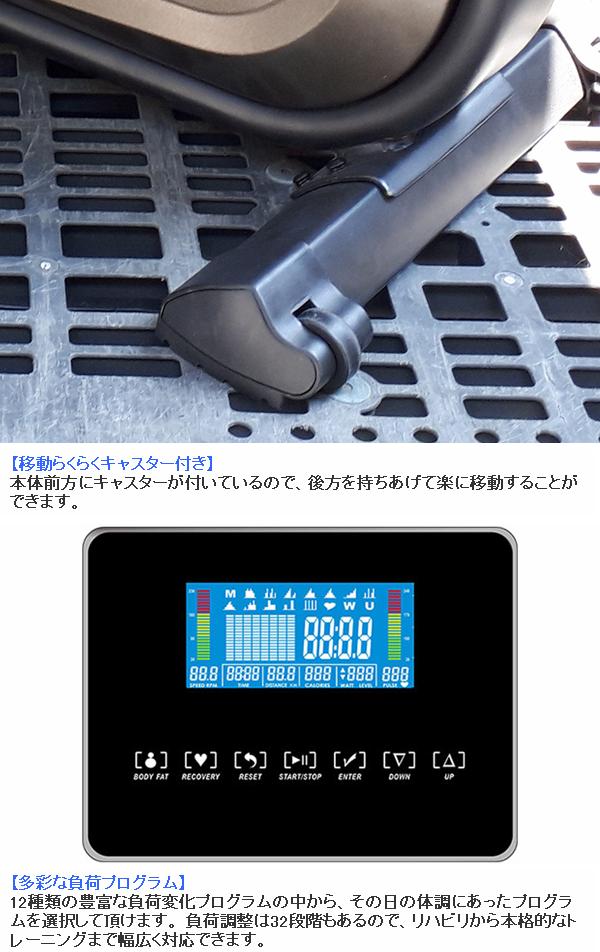 12種類の豊富な負荷変化プログラムの中から、その日の体調にあったプログラムを選択して頂けます。 負荷調整は32段階もあるので、リハビリから本格的なトレーニングまで幅広く対応できます。
