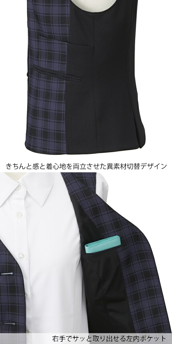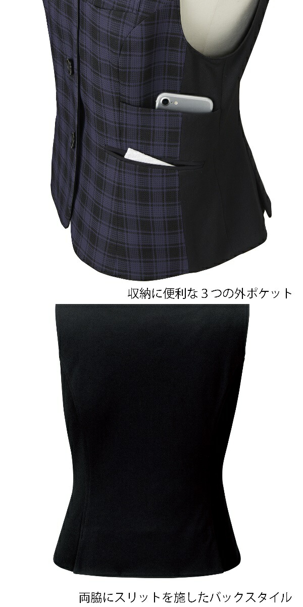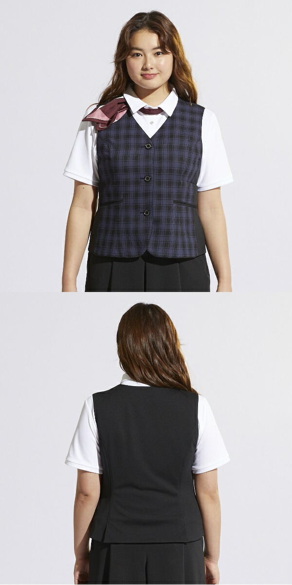 幅広い体型にフィットするよう設計されたチェック柄事務服ベスト。