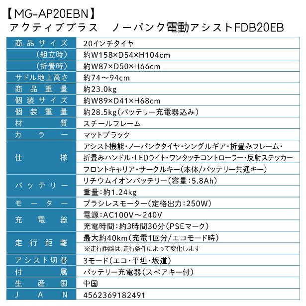 MG-AP20EBN ACTIVEPLUS ノーパンクタイヤ 電動アシスト 折り畳み 自転車 サイクル FDB20EB マッドブラック【送料無料(北海道・沖縄・離島を除く)】【メーカー直送】【同梱/代引不可】