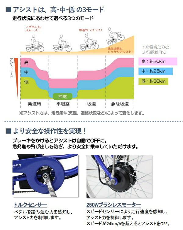 ・250Wブラシレスモーター→スピードセンサーにより走行速度を感知し、アシスト力を制御します。スピードが24km/hを超えるとアシストをOFF。