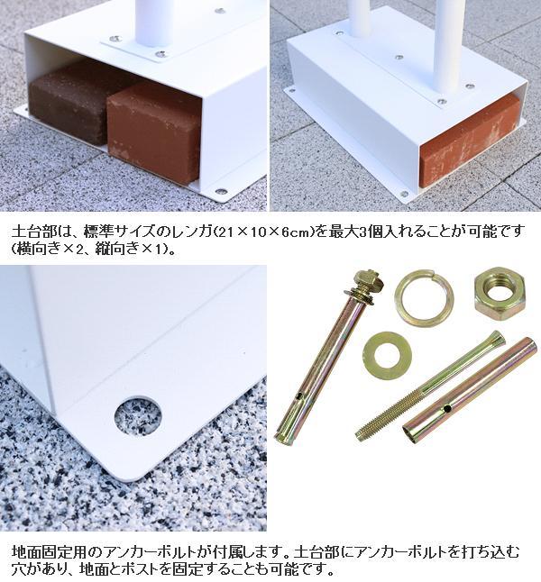 ◇地面固定用のアンカーボルトが付属します。土台部にアンカーボルトを打ち込む穴があり、地面とポストを固定することも可能です。