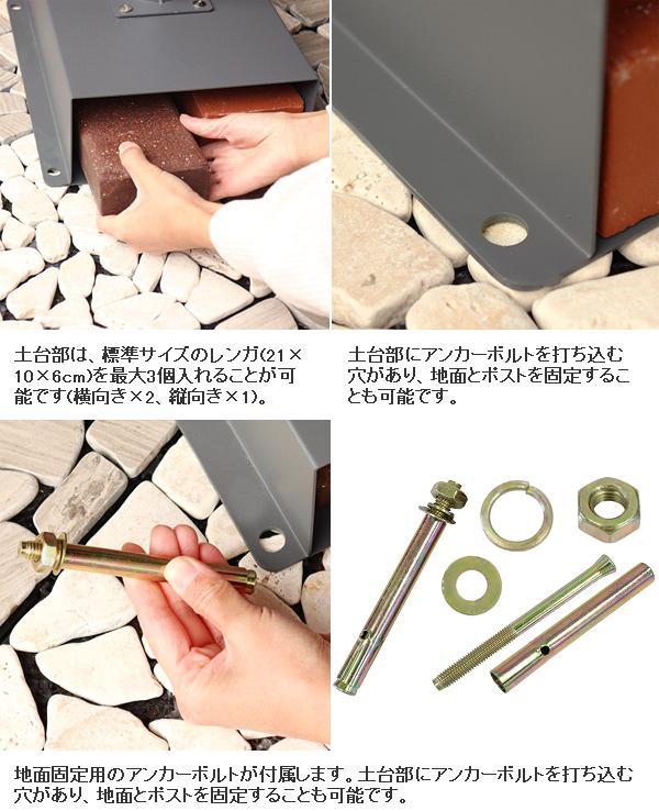 ◇地面固定用のアンカーボルトが付属します。土台部にアンカーボルトを打ち込む穴があり、地面とポストを固定することも可能です。