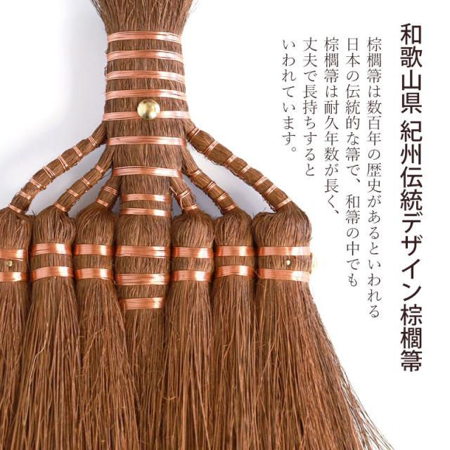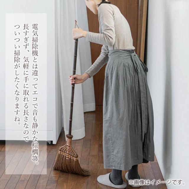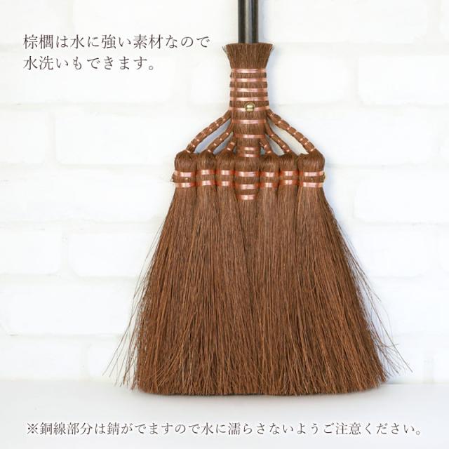 室内の畳み掃に最適。和歌山県 紀州伝統デザイン棕櫚箒。棕櫚箒は数百年の歴史があるといわれる日本の伝統的な箒で、和箒の中でも棕櫚箒は耐久年数が長く、丈夫で長持ちするといわれています。人目に触れても見苦しくないので、いつでも気軽に手にとれる場所に吊るして置けます。電気掃除機とは違ってエコで音も静かな棕櫚箒。畳にもフローリングにも適した箒です。Broom Craftを手掛ける深海産業は1950年頃から「棕櫚・シダ」商品を作り続けているメーカーで歴史ある作り方をもとに、現地熟練職人が一つ一つ手作りで製作しております。世界に羽ばたく新たな工芸品、是非一度お手にとってみてください。<棕櫚(シュロ)とは>里山では普通に見ることのできるヤシ科の常緑植物です。幹の周りの皮を編んで作られる棕櫚縄、棕櫚マットなどがあるように繊維はしなやかで非常に丈夫です。タワシ等にも使われる素材ですから水にも強いという特徴を持っています。耐久性・安全性・使いやすさを追求した使い心地をご堪能ください。棕櫚は水に強い素材なので水洗いもできますが銅線は錆がでますので水に濡らさないようご注意ください。