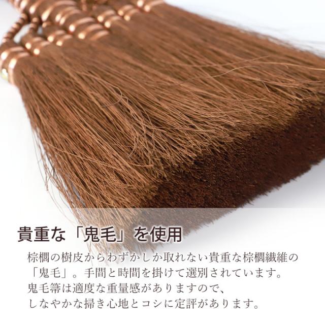 | 商品説明 | 室内の畳み掃に最適。和歌山県 紀州伝統デザイン棕櫚箒。 棕櫚箒は数百年の歴史があるといわれる日本の伝統的な箒で、和箒の中でも棕櫚箒は耐久年数が長く、丈夫で長持ちするといわれています。 人目に触れても見苦しくないので、いつでも気軽に手にとれる場所に吊るして置けます。 電気掃除機とは違ってエコで音も静かな棕櫚箒。 畳にもフローリングにも適した箒です。 Broom Craftを手掛ける深海産業は1950年頃から「棕櫚・シダ」商品を作り続けているメーカーで歴史ある作り方をもとに、現地熟練職人が一つ一つ手作りで製作しております。 世界に羽ばたく新たな工芸品、是非一度お手にとってみてください。 <棕櫚(シュロ)とは> 里山では普通に見ることのできるヤシ科の常緑植物です。 幹の周りの皮を編んで作られる棕櫚縄、棕櫚マットなどがあるように繊維はしなやかで非常に丈夫です。 タワシ等にも使われる素材ですから水にも強いという特徴を持っています。 耐久性・安全性・使いやすさを追求した使い心地をご堪能ください。 棕櫚は水に強い素材なので水洗いもできますが銅線は錆がでますので水に濡らさないようご注意ください。 使い始めの頃は、しゅろの毛や細かい繊維が落ちます。 <鬼毛とは> 一枚一枚剥ぎ取られる棕櫚皮には太い繊維や細い繊維まで様々混ざっていますが、この中から太くて良質な繊維を一本ずつ選別したものを「鬼毛」と呼ばれます。棕櫚の樹皮からわずかしか取れない貴重な棕櫚繊維です。 手間と時間を掛けて選別されています。 鬼毛箒は適度な重量感がありますので、しなやかな掃き心地とコシに定評があります。 |