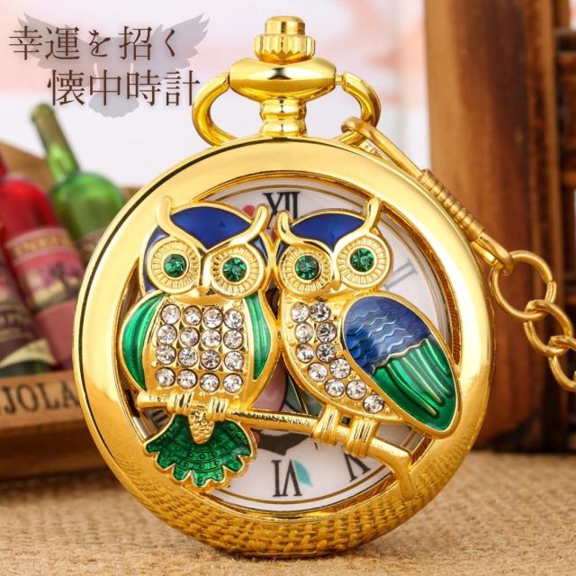 懐中時計 黄金の梟 フクロウ 2匹 ジルコニア アンティーク ゴールド チェーン付き 高耐久性 文字盤 メンズ レディース ユニセックス レトロ クラシック ヴィンテージ感 ペンダント 長持ち おすすめ おしゃれ 時計 キーホルダーウォッチ