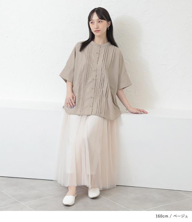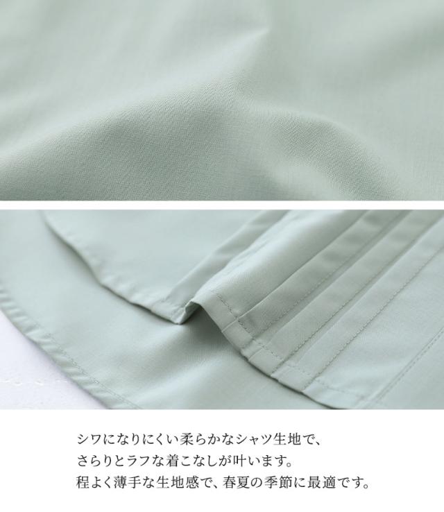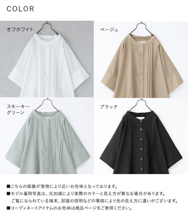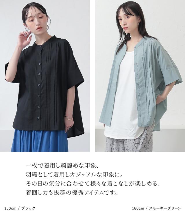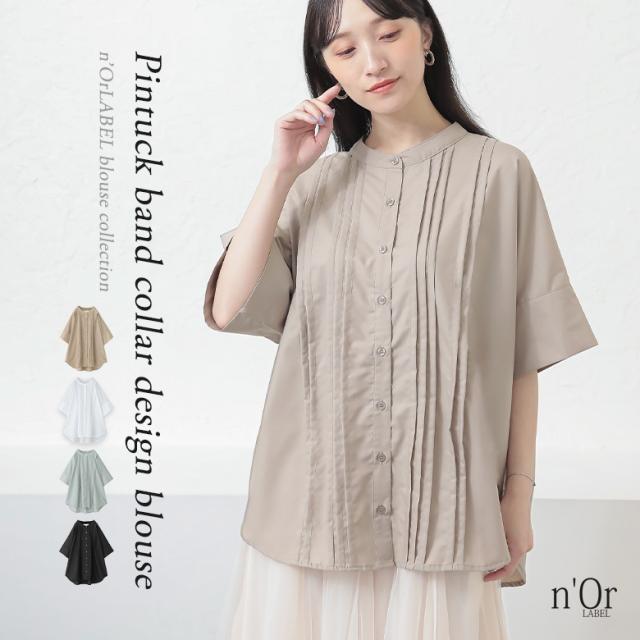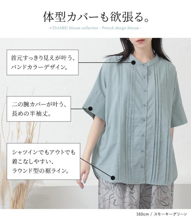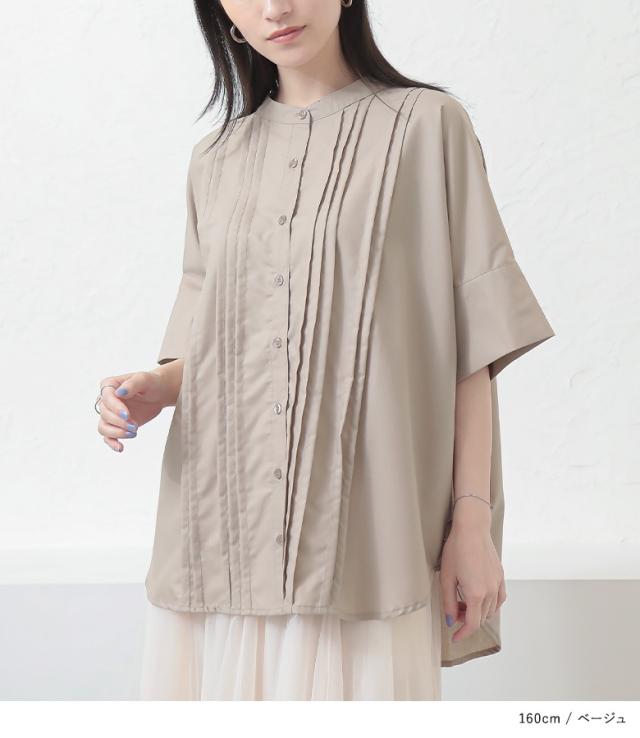『ピンタックバンドカラーブラウス』 ※メール便可※【5】[ブラウス レディース トップス 半袖 シャツ 羽織り 春夏 くすみカラー スモーキーカラー シャツ 生地 ラフ ラウンドヘム 折り返し袖 tjn0448]