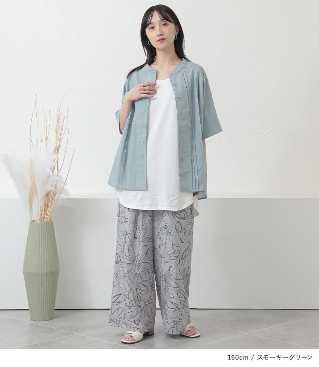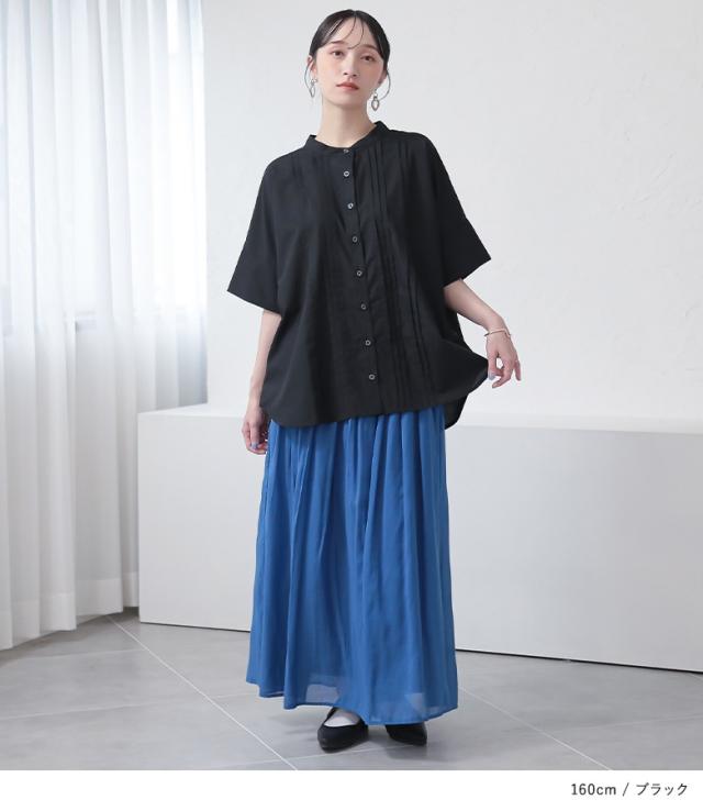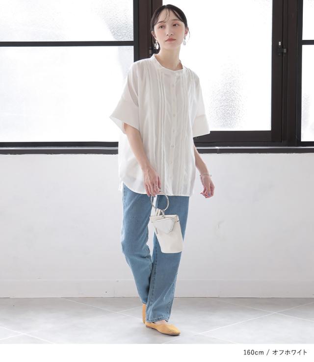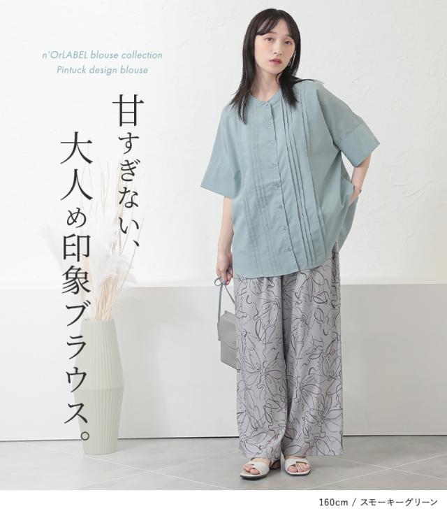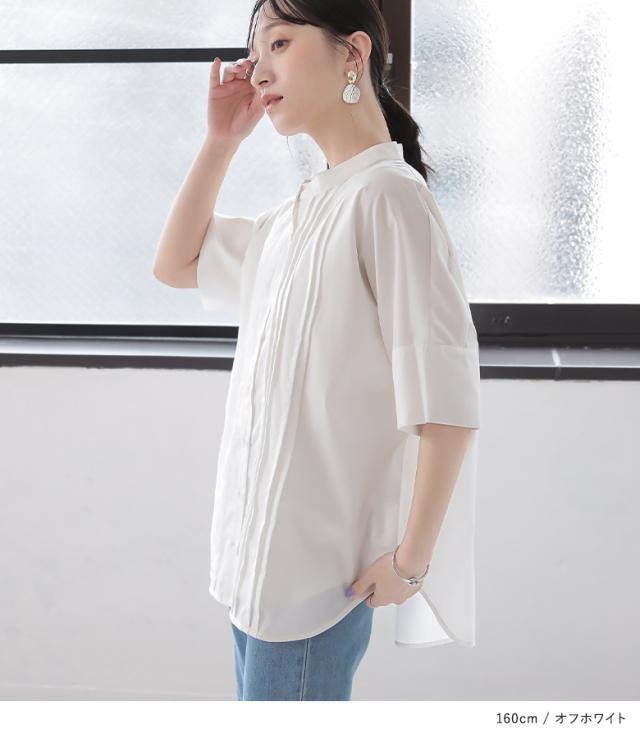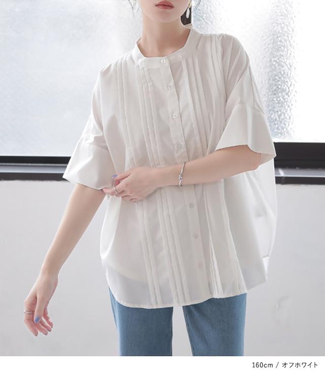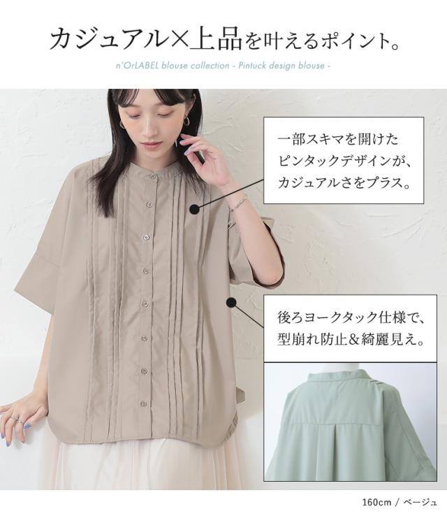 『ピンタックバンドカラーブラウス』 ※メール便可※【5】[ブラウス レディース トップス 半袖 シャツ 羽織り 春夏 くすみカラー スモーキーカラー シャツ 生地 ラフ ラウンドヘム 折り返し袖 tjn0448]