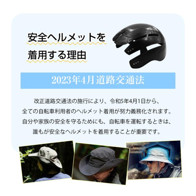 【ハット型ヘルメット】帽子のデザイン性とヘルメットの性能を両立し、オシャレをしながら頭を守ります。左右にスナップボタンが付いており、つばを折り曲げて形を変えられます!軽量タイプなので、通勤・通学中の負担が少なく肩や首が疲れにくいです。取り外しできるインナープロテクターは損傷や擦り傷などから頭を保護します!