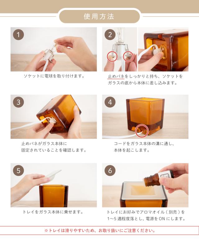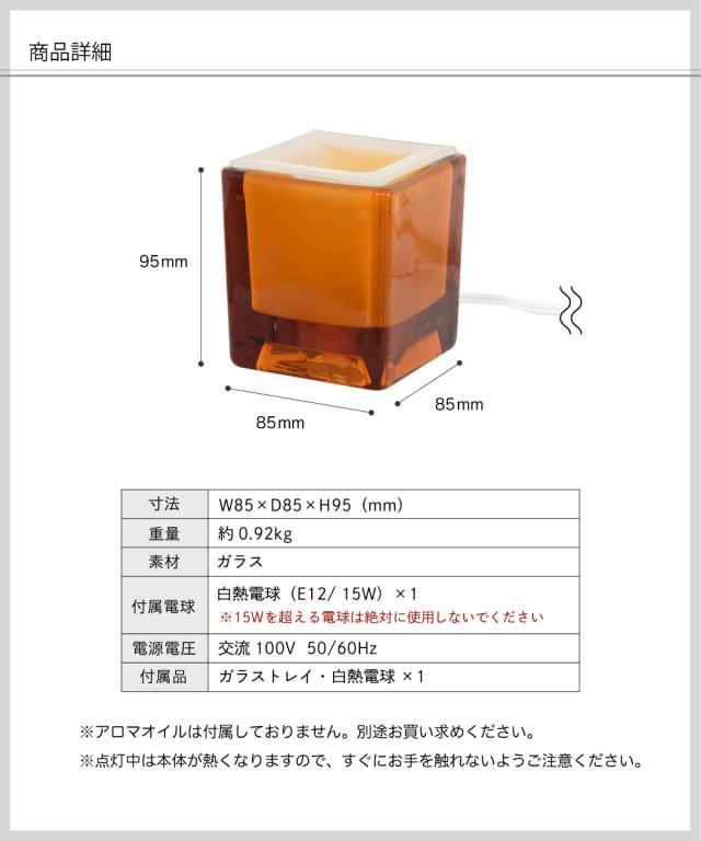 【サイズ】W85×D85×H95(mm)【重量】約0.92kg【素材】ガラス【付属電球】白熱電球(E12 / 15W)×1※15Wを超える電球は絶対に使用しないでください【電源電圧】交流100V 50/60Hz【スイッチ】中間スイッチ(ON/OFF)【付属品】ガラストレイ・白熱電球(クリアナツメ球)×1【保証】1年保証【ご注意】※アロマオイルは付属しておりません。別途お買い求めください。※点灯中は本体が熱くなりますので、すぐにお手を触れないようご注意ください。※製造工程上、ガラスの厚みの違いにより、商品の重量やサイズに個体差が発生する場合がございます。※製造工程上、ガラスにゆがみ、気泡、黒っぽい点が含まれる場合がございます。あらかじめご了承ください。