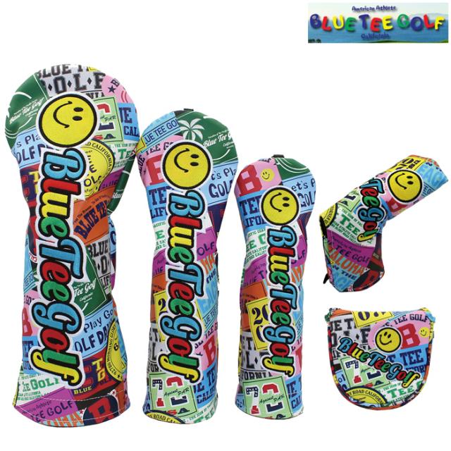 ワッペンのような柄をランダムに配した総柄で仕上げたBLUE TEE GOLFのヘッドカバー。